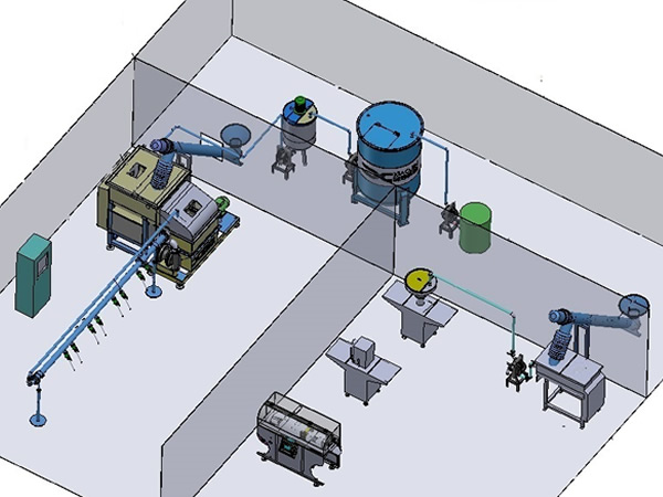 2.固化劑自動(dòng)上粉、攪拌,輸送至雙工位定量灌裝設(shè)備。